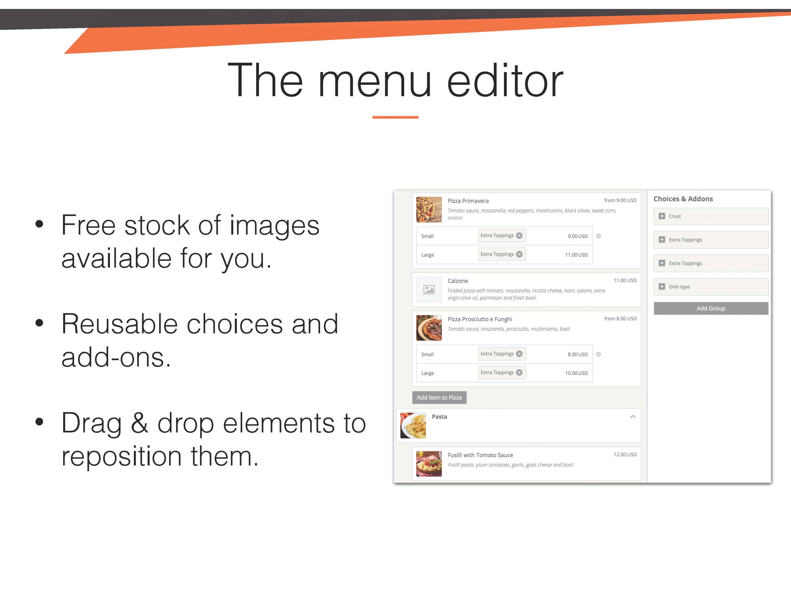 Choices and add-ons keep your menu compact and well organized.